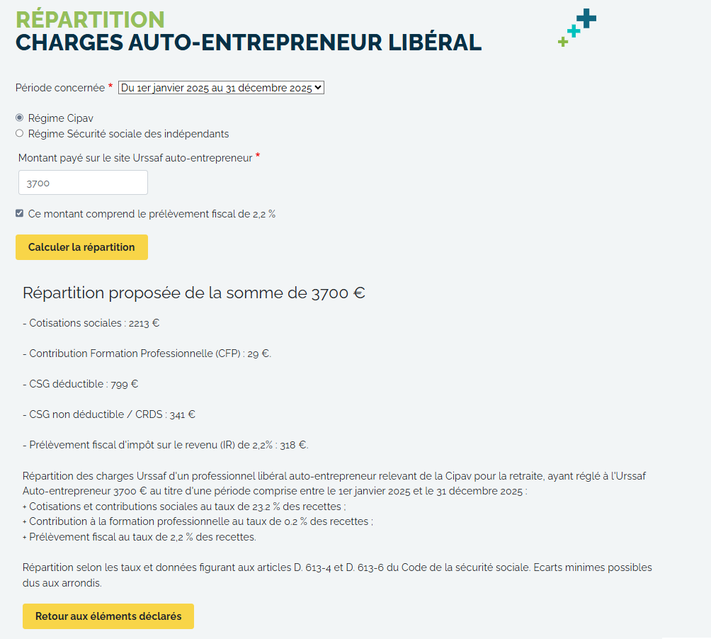 - Calcul du taux social applicable selon la période et le régime choisi (auto-entrepreneur relevant pour le retraite de la Cipav ou du régime général des indépendants).